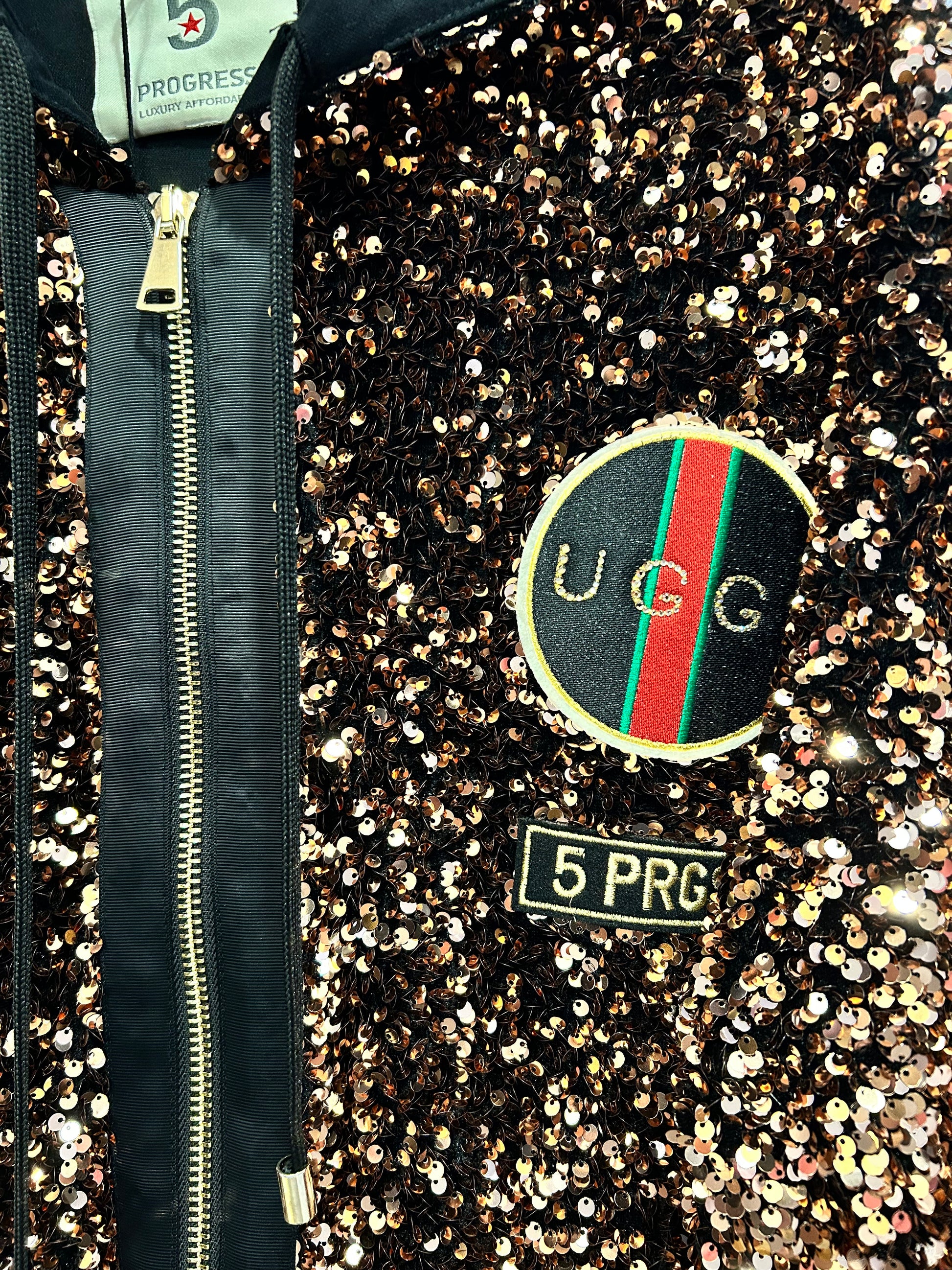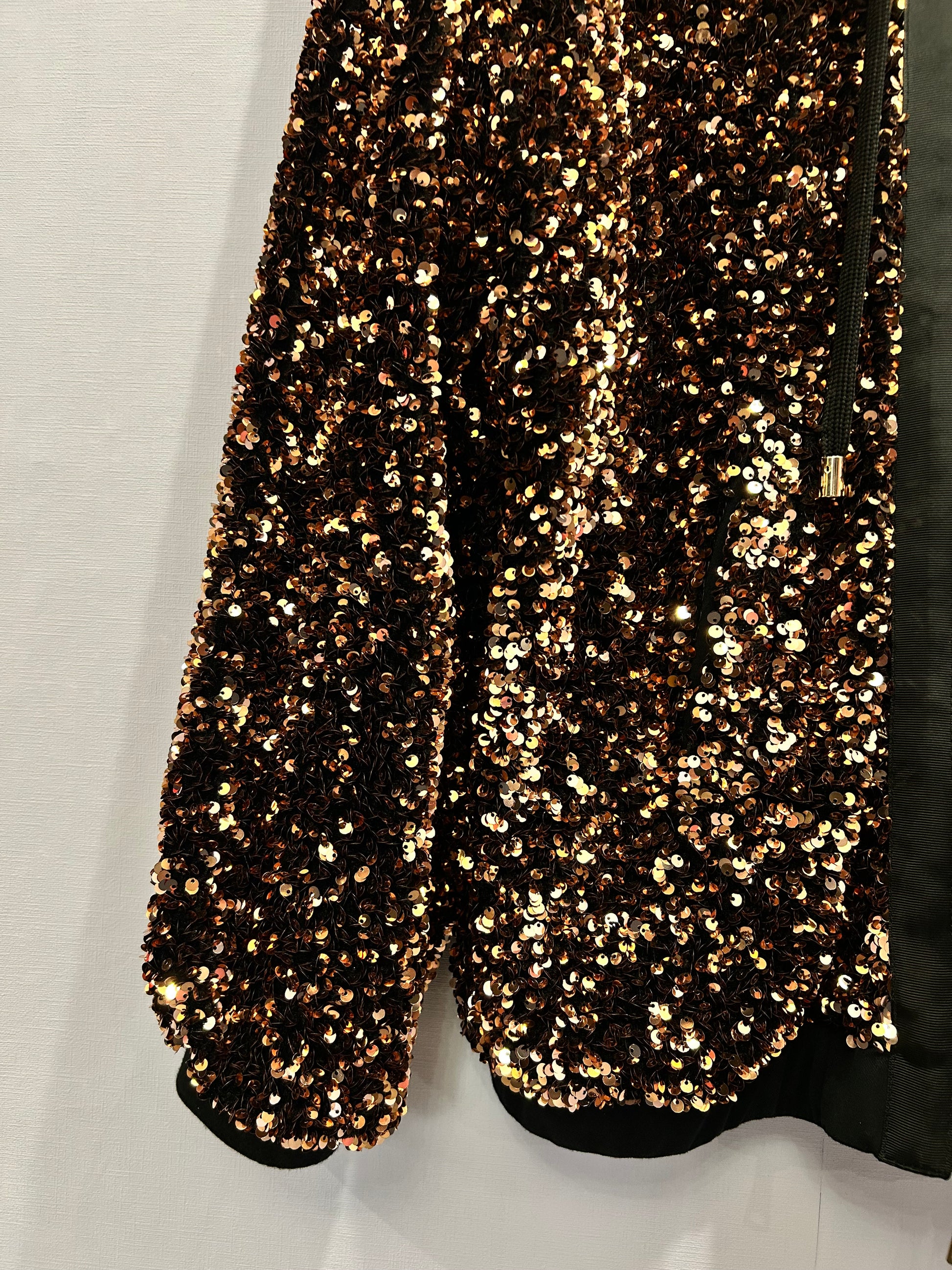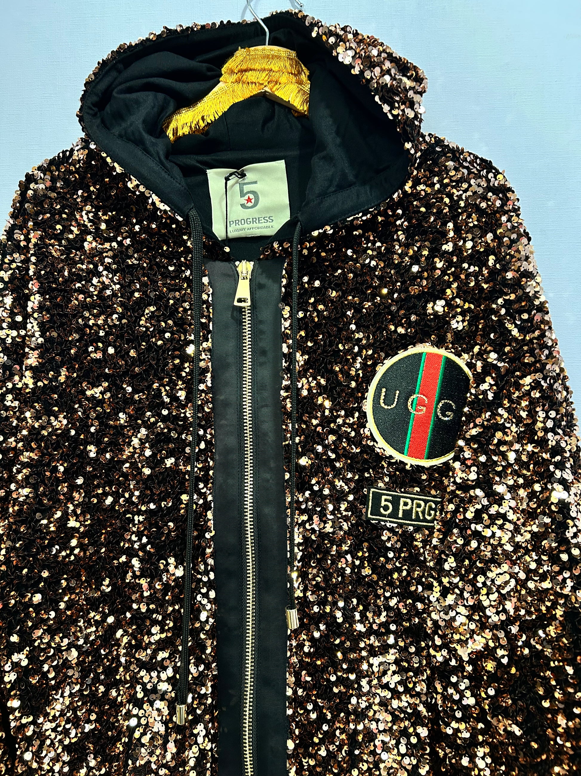 Bomber fit over della 5 Progress, completamente di lustrini sui toni del bronzo chiaro, cappuccio e zip doppio cursore sul davanti, tasche inserite