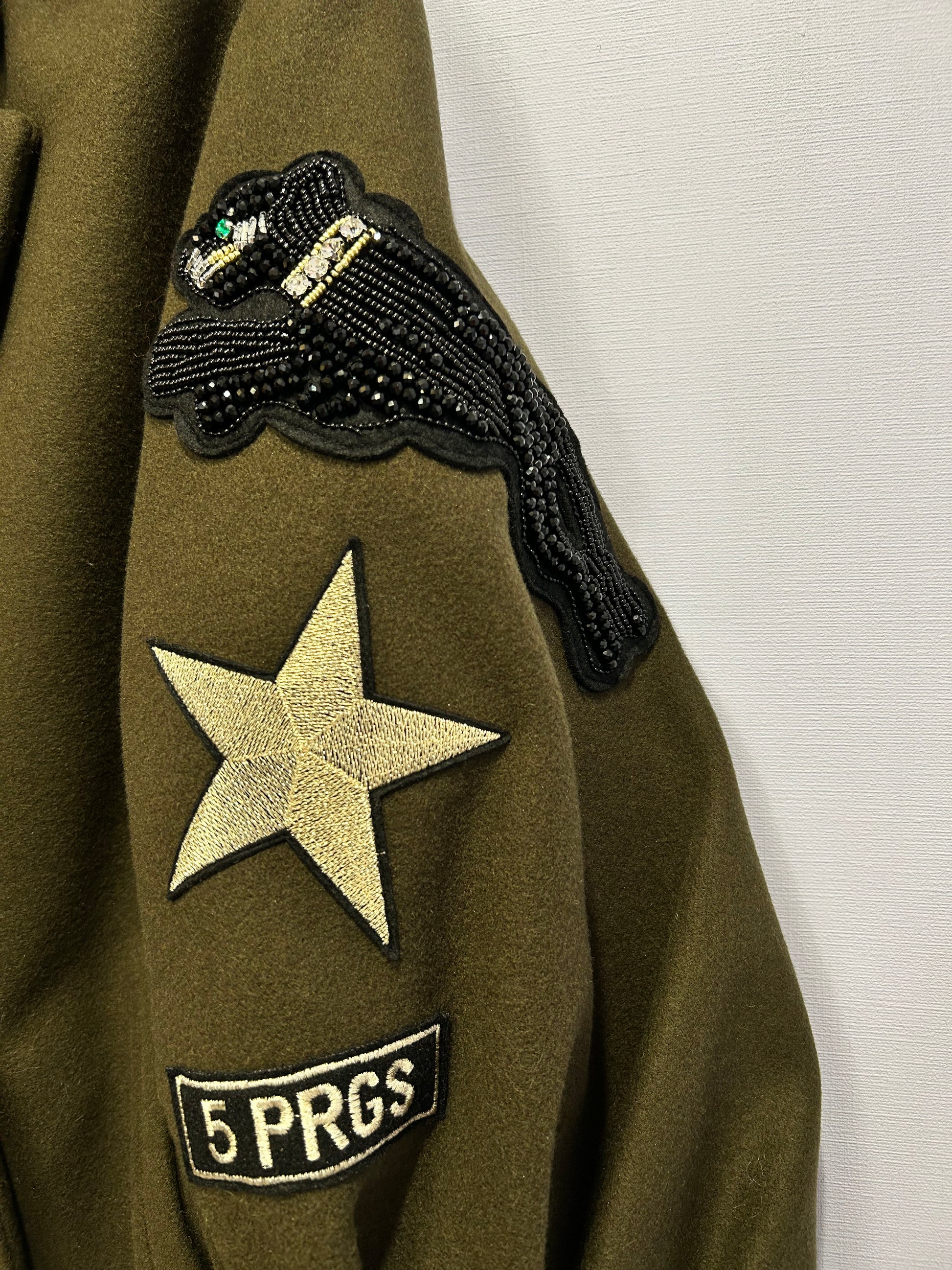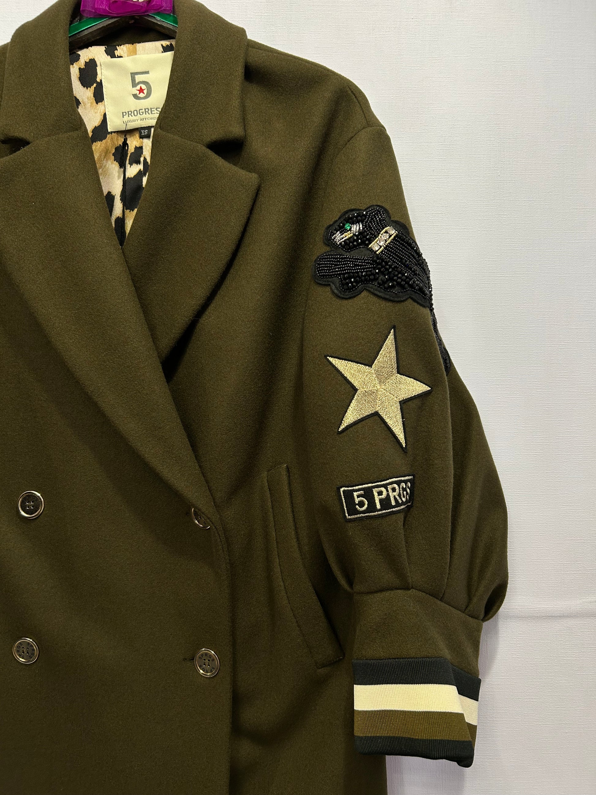 Cappotto verde bosco della 5 Progress, dal fit morbido, doppiopetto, polsini bicolore, patch inseriti sulla manica