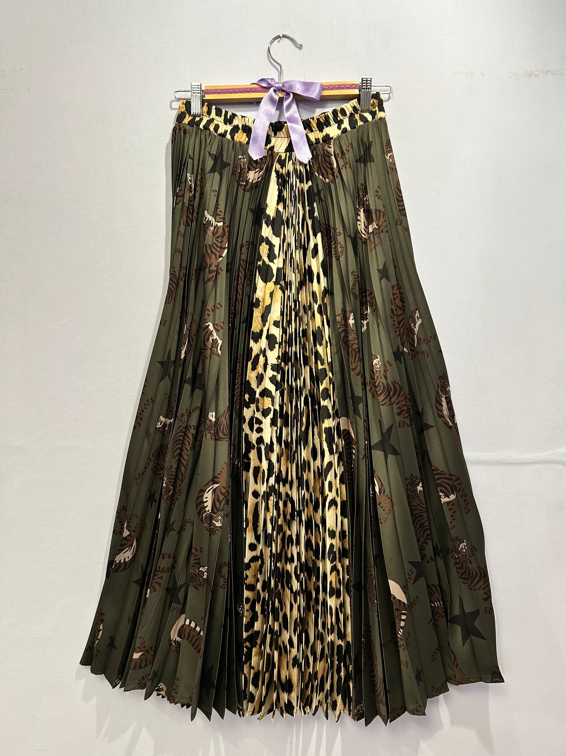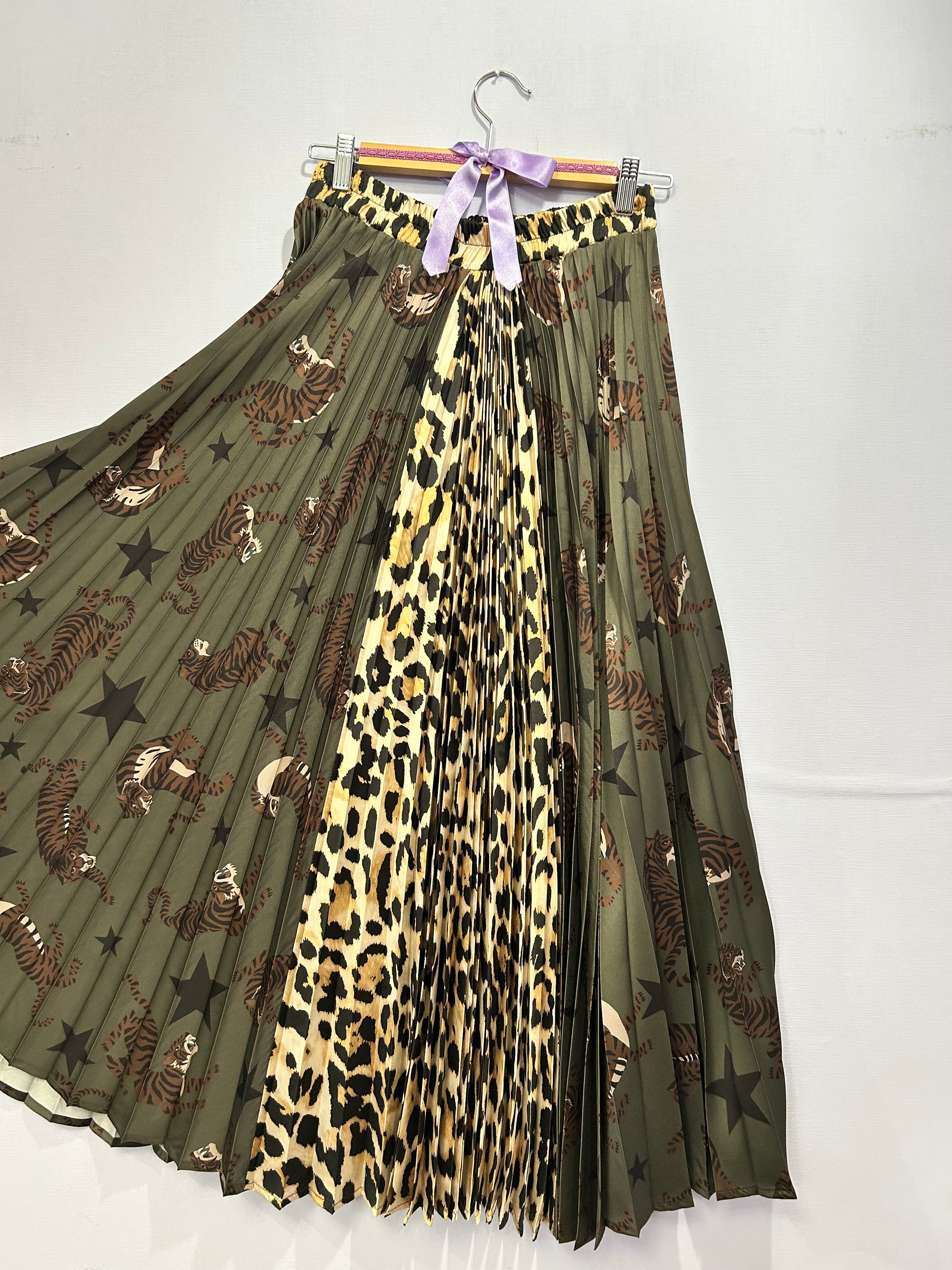 Gonna della 5 Progress, dalla plissettatura importante, inserto Leo sul davanti, elastico in vita. Fantasia Tiger print